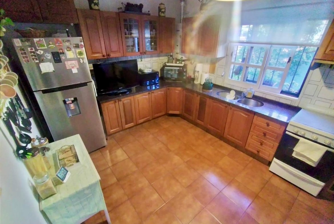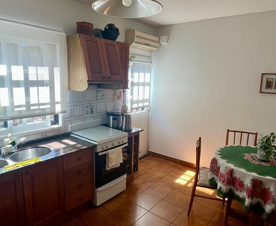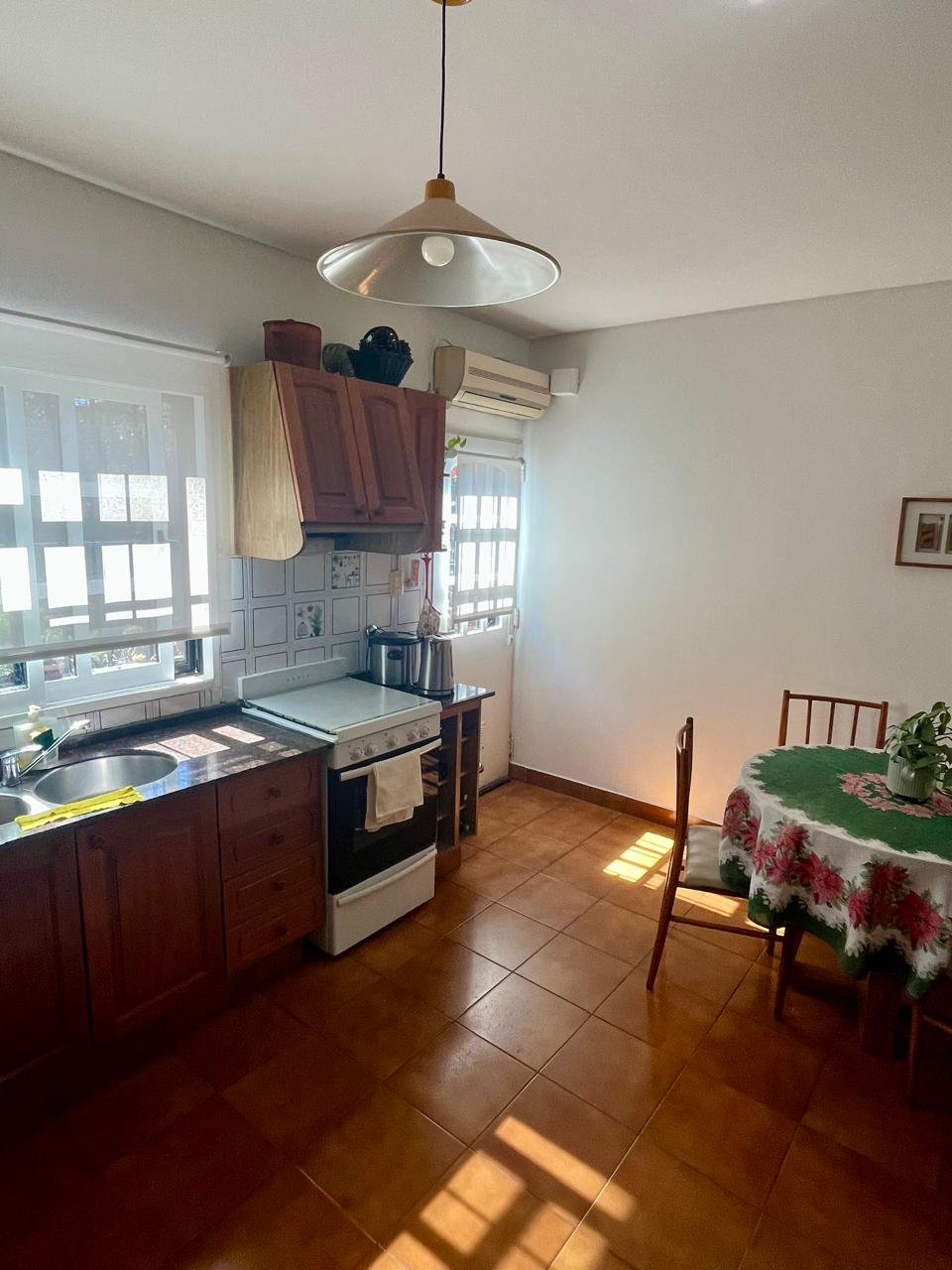 Living comedor con ventanal al frente, toil de recepción, amplia cocina comedor con muebles altos y bajos muy luminosa con salida a jardín.
